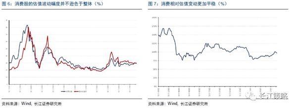 虽然整体上消费业绩与市值有很强的相关性,但是这并不代表着消费本身的的估值波动是较小的,相反,与市场整体的估值相比,消费的波动其实并不逊色。在历史的牛市中,消费股整体也曾经到达80倍以上的估值高位。因此,我们认为,如果要讨论绝对估值的问题,难免会引入市场整体风格与情绪的问题,势必将问题复杂化。因此,我们在本篇报告中,将重点研究相对估值的变动,即重点研究,何时投资者愿意给予消费股更高的相对估值?