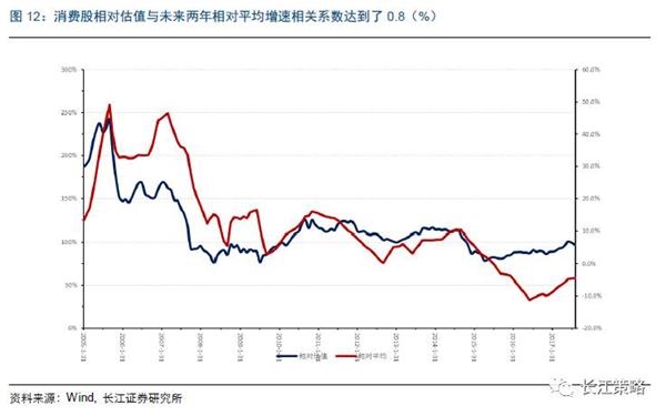 3、由于消费的业绩增长具有稳定性,投资者关注的是消费股相对增速的可持续性,数据上体现在未来两年相对业绩复合增速或者未来两年业绩平均相对增速与相对估值的相关性上。