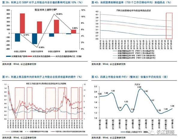 此外,利率上行虽然对净资产产生负面影响,但有助于修复险企的有效业务价值和新业务价值预期。EV=调整净资产(50%)+有效业务价值(50%),综合来看利率上行对于EV有明显提升作用,根据长江非银研究组的测算,当利率上行50BP将带来险企EV在10%左右的提升。