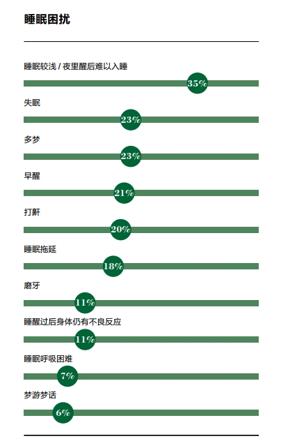 其中,睡眠较浅/夜里醒后难以入睡是最普遍的睡眠困扰,占比超过3成;其次是失眠和多梦,占比分别为23%。