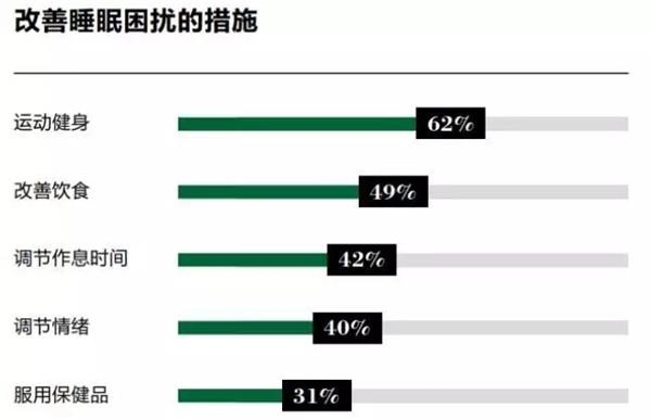 睡不好怎么办?据了解,超过6成的受访者将运动健身作为改善睡眠困扰的最主要方式。其次,近5成选择通过调节饮食和作息时间来改善睡眠困扰。