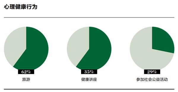 在心理健康行为上,62%的高净值人群通过旅游来改善自我精神状态,从而提高心理健康水平。受访的高净值人群表示,每年基本都会有2-3次长途旅行;其次,有35%的高净值人群会参加健康讲座;29%的高净值人群选择参加社会公益活动。