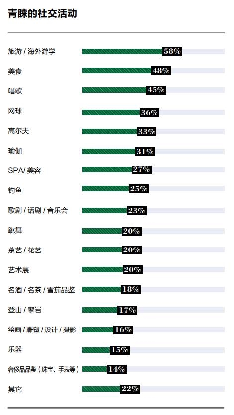 在中国高净值人群所青睐的具体社交活动中,文化旅游/海外游学占比最高,达到58%;其次是参与各种美食活动,占48%;唱歌与打网球分列三、四位,比例分别为45%与36%。