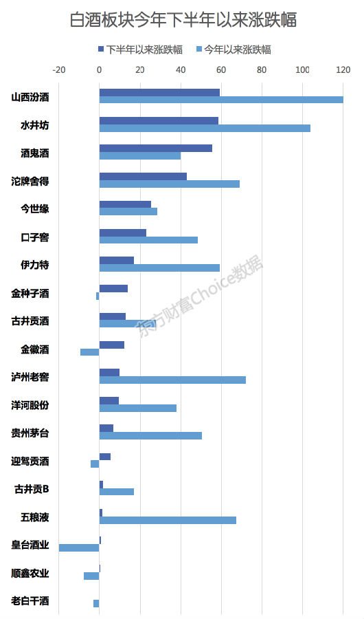 数据显示,今年下半年以来,白酒板块全线上涨,其中二线白酒涨幅尤为显著。截至9月20日,山西汾酒、水井坊、酒鬼酒、沱牌舍得、今世缘等涨幅居前,下半年以来分别上涨59.30%、58.64%、55.44 %、43.03%、25.68%。