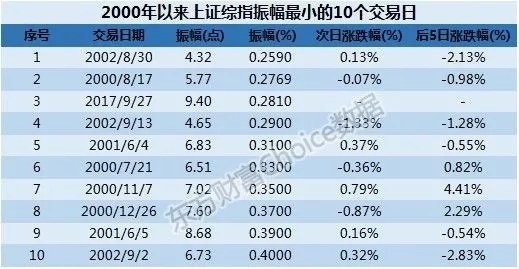 东方财富Choice数据显示,周三沪指0.28%的振幅为2002年8月30日以来的15年新低,当日沪指振幅为0.26%。假如从2000年开始算起,周三沪指振幅也排在倒数第三位,2000年8月17日排名第二,当日沪指振幅不到0.28%。