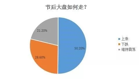 节后大盘走势如何?东方财富网调查显示,有50.2%的网友对股市比较有信心,认为节后大盘会上涨;有28.6%的网友对节后大盘走势不乐观,认为有下跌可能;还有21.2%的网友认为节后大盘走势维持震荡。