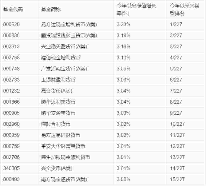 老揭看基金根据银河证券数据整理发现,截至9月22日,今年以来纳入统计的227只货币市场基金(A类)平均收益率为2.65%,你们都很熟悉的余额宝收益率是2.82%,处于中等偏上水平,那么年内收益TOP 10是谁?收益率如何?我统计了今年以来3%以上收益的货币基金。