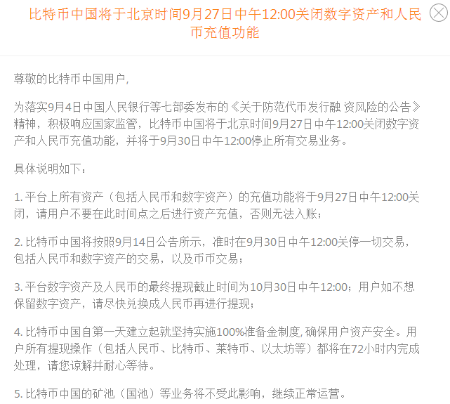 比特币中国今日早间发布公告称,将于北京时间9月27日中午12:00关闭数字资产和人民币充值功能;9月30日中午12:00关闭所有交易功能。具体公公如下: