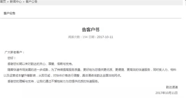 韵达在告客户书中强调,随着快递市场发展的进一步成熟,为了持续提高服务质量、更好地为您提供更优质、更便捷、更高效的快递服务,同时受人力、物料以及运营成本攀升等影响,从即日起,对快件价格进行调整,具体请咨询韵达全国当地网点。
