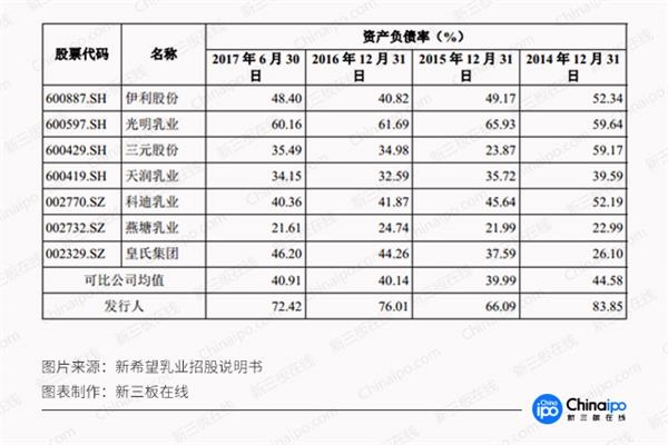 2014年、2015年、2016年和2017年上半年,新希望乳业的资产负债率分别是83.85%、66.09%、76.01%和72.42%。