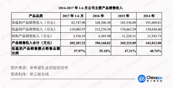 新希望乳业的低温奶产品的销售额呈现逐年增长趋势。该类产品销售额占比已从2014 年的40.74%提升至2017年6月底的57.97%。