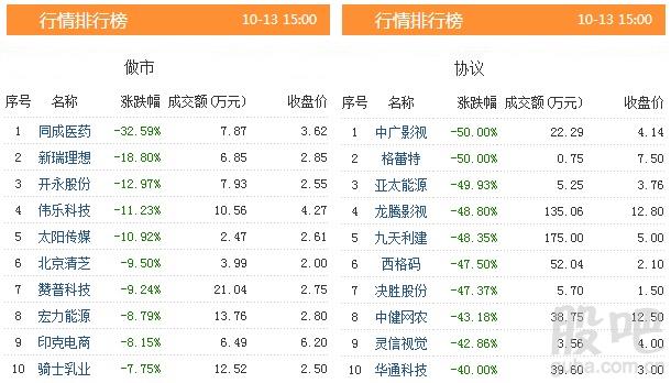 13日共有838只股票发生交易,成交金额7.17亿元,做市转让成交1.45亿元,协议转让成交5.72亿元,成交数量12749.03万股。