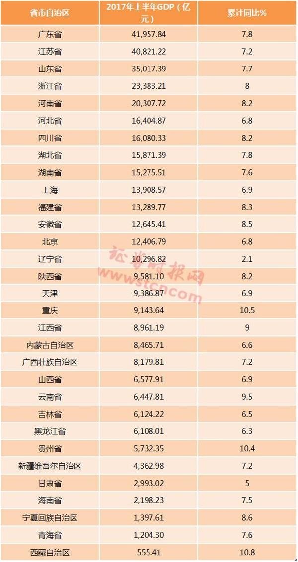 各省市今年上半年GDP及同比增速