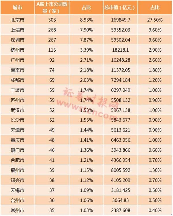A股上市公司数量排名前20的城市及市值