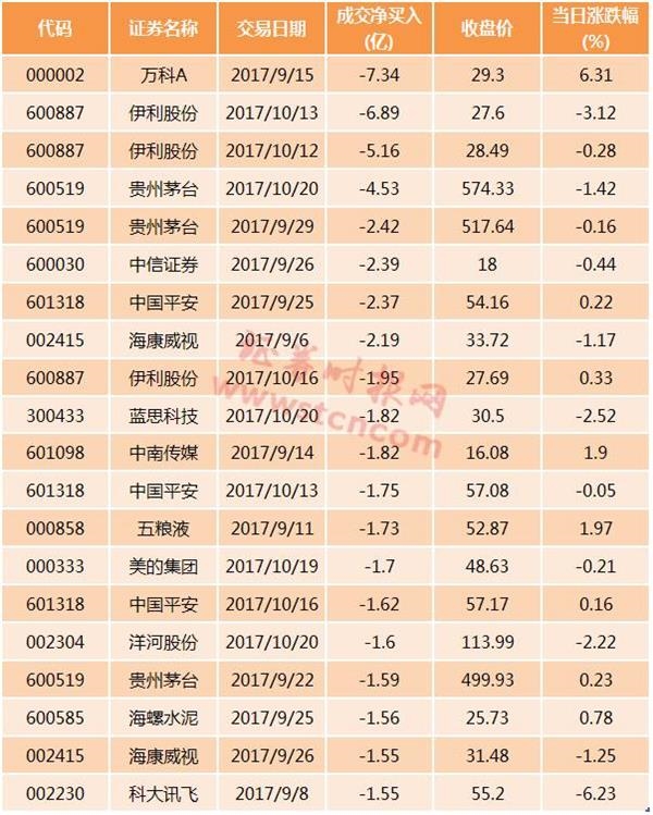 9月份以来,北向资金单日净卖出最大的个股是万科A,发生在9月15日,净卖出7.34亿元;伊利股份10月12日、13日被连续净卖出5.16亿元、6.89亿元;贵州茅台、五粮液等也录得多次亿元以上净卖出。
