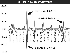 这些摘牌企业的财务绩效具体如何,由表2可以看出,摘牌公司的财务绩效表现出了非常相似的特征。结合图2不同时期的财务绩效得分走势,纵向来看,大多数企业T-1期盈利因子为负数,说明在挂牌前1年相对于挂牌前2年盈利能力有所下降;而T0期绩效多为正数,即挂牌新三板初期企业财务绩效有所上升;到了T1期,摘牌前1年相对于摘牌前2年而言盈利因子又呈现出负数。横向来看(表2),T1期的绩效低于T0期,T0期的绩效高于T-1期,数据呈现出非常明显的倒“U”型,可见挂牌新三板对企业的财务状况并没有带来明显的改善。