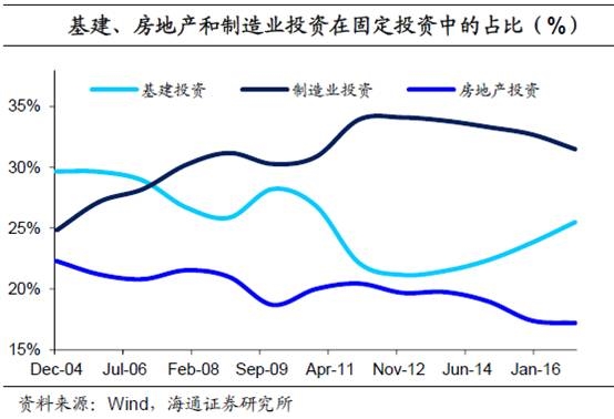 对于我国来说,基建投资一直是经济增长的主要动力之一。2012年以来,我国基建投资同比增速一直维持在20%左右,远高于房地产投资和制造业投资。在民间投资持续疲软的情况下,以政府主导的基建投资成为我国固定资产投资主要的增长来源,投资占比也从2012年的21%持续上升到2016年的25%。