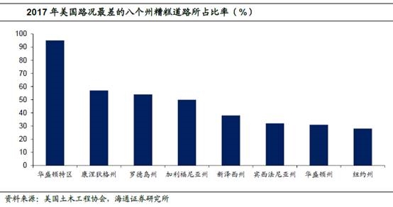 首先,美国的基建投资走弱并不是因为美国的基础设施建设已经达到饱和。美国的大部分基础设施建于上世纪30-60年代,目前大量设施老化严重。根据美国土木工程协会2017年的基础设施报告,美国的基础设施整体评级为D+,其中航空业、饮用水、公路和公共交通均处于极度不佳状态。根据协会的评估,美国到2025年之前需要投入4.5万亿美元进行设施维修和改善,而目前仍然有2万亿的缺口。