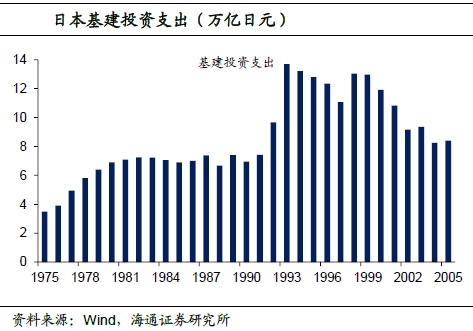 特别是在90年代房地产泡沫破灭以后,日本经济陷入了流动性陷阱,日本政府采取持续大规模的财政刺激政策。1993年日本公共工程的财政支出一度达到13.7万亿日元的历史最高值,直到2001年公共工程支出规模一直维持在10万亿日元以上。分细项来看,1993年日本的公共工程支出占财政支出的比重高达18%,基本接近社会保障支出和国家债务清偿的占比。