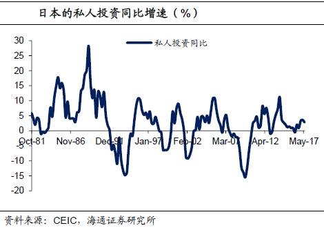 与美国经济回暖相比,日本自90年代危机以后经济就难有起色,其主要原因是经济缺乏内在动力。首先,日本私人消费一直持续低迷。1993年是日本消费变化的分水岭,1993年之前日本的消费同比增速与美国相当,一直维持在5%-10%的区间。1993年以后,日本的消费同比增速中枢下滑到0%。