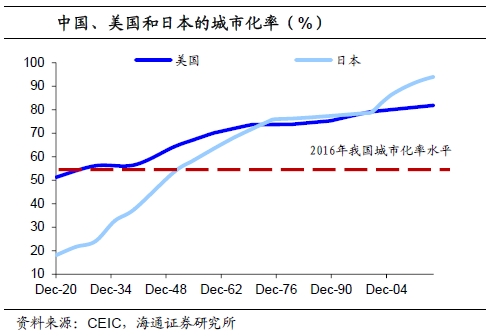 以传统的基础设施水平来比较,目前我国的情况仅相当于美国和日本基建投资高速增长的初期。具体来看,2016年我国的城市化率为54.4%,相当于日本50年代初和美国20年代初的水平。2016年我国的公路密度为5000公里/万平方公里,仅为40年代美国水平的72%和日本水平的20%。但是我国的现代化基础设施水平其实并不弱,2016年我国的高铁和高速公路密度分别为23公里/万平方公里和116公里/万平方公里,高铁密度远高于美国。此外,我国的宽带用户覆盖率在23%,也仅略小于美国和日本。