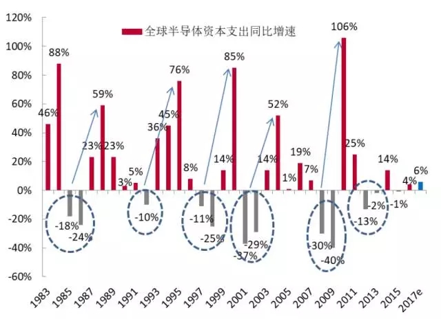 1983-2016年半导体行业资本支出同比增速呈周期性