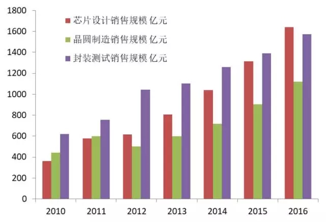 第一,我国集成电路产业已经形成了较为完善的产业链格局。设计、制造、封测并举,产业规模快速增长。其中,芯片设计业销售规模由2010年的363亿元增长至2016年的1642亿元,晶圆制造业销售规模由2010年的441亿元增长至2016年的1121亿元,封装测试业销售规模由2010年的621亿元增长至2016年的1572亿元,年均复合增长率分别达28.6%、16.8%和16.7%。