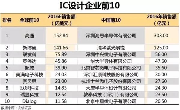 安信证券指出,近年来我国IC设计产业发展迅猛,在产业链中占比达37.93%。相关IC设计公司在2016年达到1362家,同比增长85%。2009年我国仅华为海思跻身全球前50强;截至2016年,已有11家IC设计企业在列。