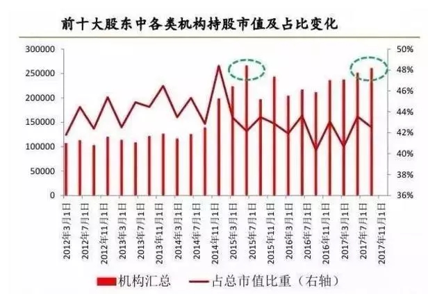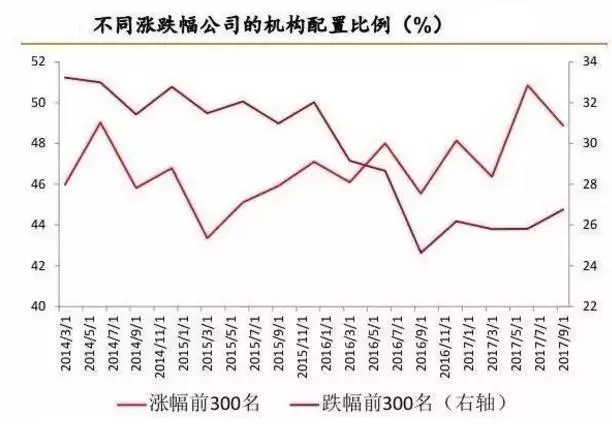 从涨幅来看,机构投资者在不同市值公司上的持股变化也十分鲜明。2014年以后,机构在小市值公司上的持股比例是持续下降的。机构的配置比较明显地影响了市场风格,2017年以来涨幅前列的公司机构配置都是逐季增加,而跌幅偏高的公司机构持股却是在下降。