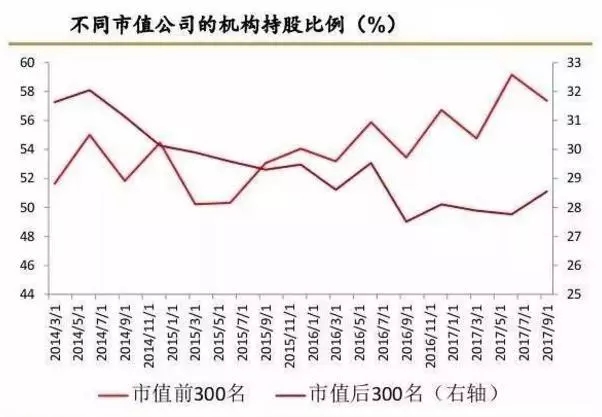 而机构投资者的行为变化对市场的结构性行情有明显影响。当前机构更乐于配置市值较大的公司,过去两年里在大市值公司中的持股比例显著提升,由此前的50%提升到56%,而对于小市值公司的配置比例则持续下降,从2014年的32%下降到今年二季度的28%,直到三季度才有所回升。