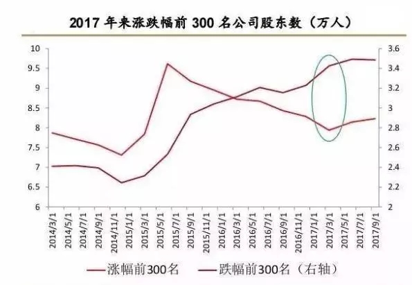 而有趣的是,个人投资者参与度下降与机构形成了对比。西南证券数据显示2016年以来,涨跌幅与公司股东人数的负相关性比较明显,而这些公司恰恰是机构持股较多的公司。从2017年涨跌幅前300名公司的股东人数变化情况来看,涨幅前300名的公司,股东人数自2015年中旬以来有一个明显的下降趋势,直到2017年中旬才开始企稳。