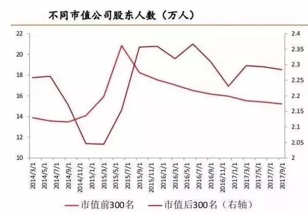 2015年二季度以来,市值排名前300名的公司股东数量持续下降,从20万名下降到了15万名左右,下降了25%。而市值排名后300名的公司股东数量自2015年三季度以来基本保持在2.3万人左右,在2017年一季度甚至有所上升。