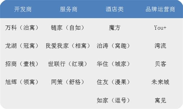 目前,长租领域主要有四类参与者,开发商类(万科、龙湖等)、中介类(链家、我爱我家等)、酒店类(华住、如家等)和创业类(You+、湾流等).