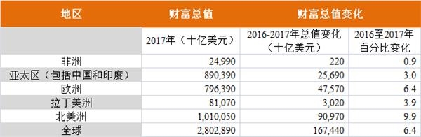 瑞士信贷14日发布的《2017全球财富报告》显示,至2017年年中的过去一年,全球财富总值增加16.7万亿美元至280万亿美元,攀升6.4%,创下自2012年以来最大增幅。这反映出非金融资产增长与股市普涨旗鼓相当,非金融资产增幅今年首次高于2007年金融危机前的水平。财富增长亦胜于人口增长,全球成人平均财富增长4.9%,创下成人平均财富达56,540美元的历史新高。