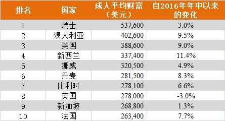 表二:2017年年中成人平均财富最高的10个主要经济体(美元)
