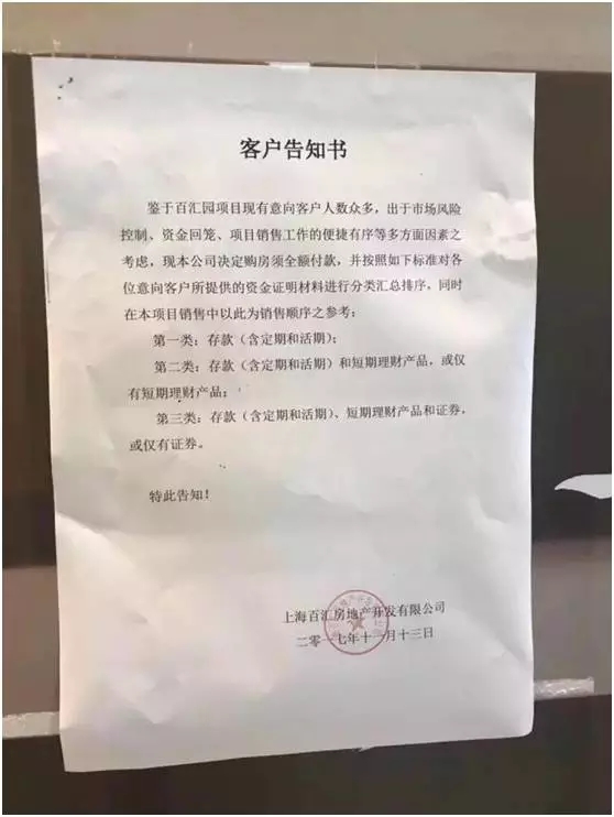 而前几天,有网友爆料,位于上海徐汇滨江的百汇园楼盘,因为购买意向的客户较多,且开发商渴望回笼资金,售楼处竟于前天贴出告示:要求客户必须全款购房!