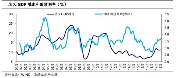 名义GDP角度。从拐点来看,名义GDP在17年中出现拐点,但由于金融监管政策的影响,国债利率依然上行。从绝对利率水平来看,10%~12%的名义GDP增速对应的十年期国债利率均值3.5%,而17年四季度以来国债利率一度破4、远超历史均值。从我们根据工业增加值、CPI和PPI拟合的名义GDP增速来看,18年名义GDP增速将明显下行,这意味着当前3.9%~4.0%的十年国债利率处于顶部区域并明显超调。