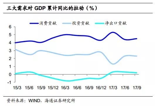 本轮经济回升主因出口和投资拉动。17年新周期的起点还是旧经济的延续成为争论焦点。17年上半年经济增速回升至6.9%,主要靠出口与投资拉动。其中出口累计增速从16年末的-7.7%回升至17年中的8.1%。三大投资中,地产投资反弹,源于过去两年低利率、地产刺激政策以及棚改货币化安置;库存回补支撑制造业投资;财政超支带动基建投资维持高位。