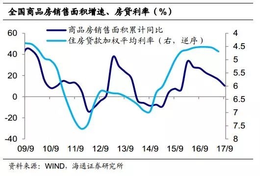 地产投资拐头向下。从投资来看,下半年投资增速下行,其中地产投资增速在10月降至5.4%的低位。从历史经验来看,地产销售一般领先地产投资2-3个季度,地产销量增速在1季度冲高后持续下滑,并在9月转负、10月跌幅扩大。在地产去库存力度暂缓、楼市调控加码、房贷利率回升的背景下,居民举债减速,地产销售下滑仍将持续,对地产投资及相关可选消费的影响才刚刚开始,未来地产投资仍将趋势性下行。