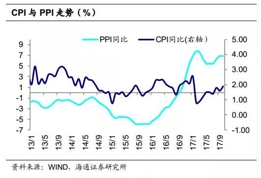 PPI向CPI收敛,通胀仍在温和区间。当前PPI高企CPI低迷,需求回落和贫富差距约束下,PPI将大概率向下与CPI接轨。18年CPI或前高后低,同比均值在2.0%左右,油价因素也不会改变PPI同比的趋势性下行。