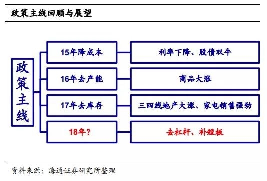 过去几年,国内经济和资本市场发生了巨大的变化,而这背后的主要推动因素就是供给侧改革,回顾过去三年,我们发现每年都会有一条政策主线:15年是供给侧改革元年,当年的主要政策是降成本,手段是降息降准,带来了股债双牛。16年的政策主线是去产能,带来了商品价格大涨,而17年的主要政策是去库存,居民加杠杆推动三四线地产大涨。