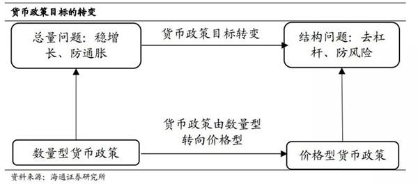 根本原因是货币政策目标有所转变。为何货币政策框架从数量型转向价格型?第一,表外业务放大货币乘数,货币数量相关指标逐渐失效。第二,利率市场化不断发展,利率传导机制逐渐完善。第三,根本原因是,货币政策目标有所转变,即由稳增长和防通胀的“总量问题”,逐渐转向去杠杆和防风险的“结构问题”。因此,价格型货币政策逐渐取代数量型,尤其是宏观审慎政策框架确立之后,双支柱的调控体系对于防范系统风险,降低杠杆率起到了重要作用。