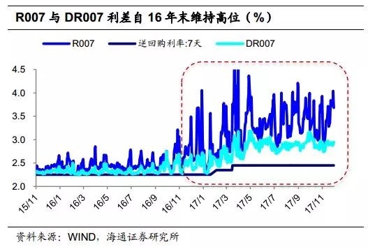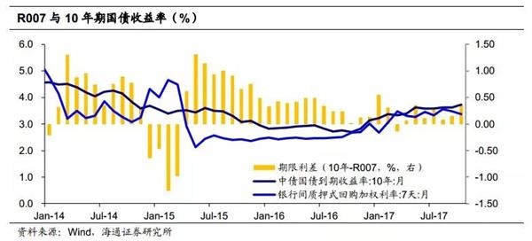 期限利差角度。过去5年,我国10年国债收益率与R007利差均值为20bp.2013年钱荒时期,期限利差全年均值为-28bp,曲线一度倒挂显著。14-16年随着资金利率下行,期限利差均值为40bp左右。我们预计18年R007中枢在3.3%左右,期限利差若为20-40bp,那么对应10年国债收益率区间在3.5%-3.8%左右。
