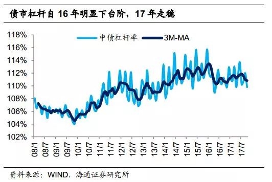 债市杠杆同样走稳。场内债市杠杆率自16年明显下台阶,16年3月至17年10月银行间债市杠杆率均值为111.1%,而15年均值为112.4%。进入17年,场内债市杠杆率整体平稳,其中2季度较16年同期明显抬升。