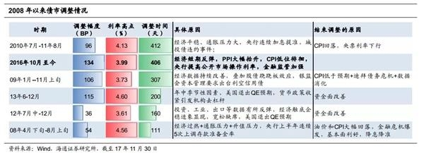 调整幅度角度。从调整幅度来看,本轮债市调整幅度高达130~140BP、创08以来最大调整幅度。从调整时间来看,截至11月末本轮债市调整时间超过400天,调整时间与2010年7月那一轮债市调整时间相当。这意味着从调整幅度和调整时间来看,本轮债市已经创08年以来最大调整,利率易下难上。