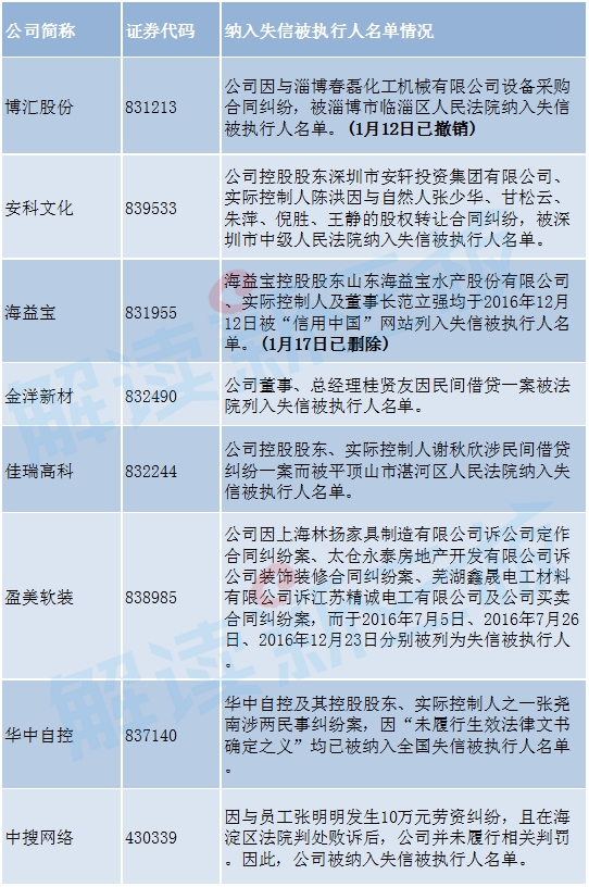 截至2017年2月20日,《监管问答》出台未满一个月,新三板已有8家挂牌企业“自曝”进入失信黑名单,分别是:华中自控、中搜网络、海益宝、盈美软装、博汇股份、佳瑞高科、金洋新材、安科文化。