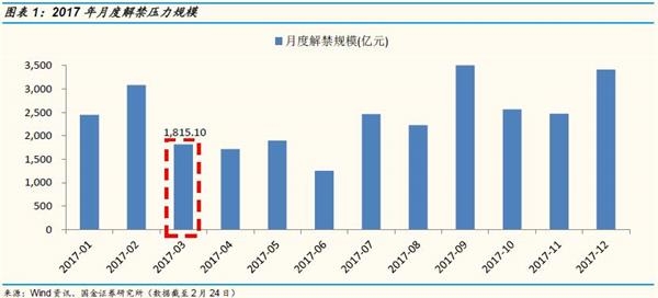以2月24日收盘价测算(下同),2017年全年解禁规模约2.89万亿,其中3月为1815.10亿,为全年单月解禁规模第3小的月份,低于全年单月解禁规模均值;另外,3月解禁规模较2月份(3082亿)回落1267亿,环比下降41.1%。