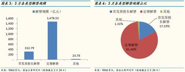 1)3月份解禁规模约1815亿,低于全年单月解禁规模均值,是全年单月解禁规模第3小的月份,且以定增解禁为主;
