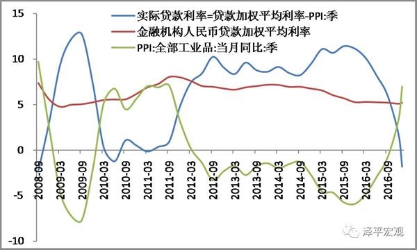 我们把贷款加强利率减掉PPI作为实际贷款利率,2014、2015年我们不断的降息、降准,政策基准利率处在历史的低位,但是我们PPI不断的回升,意味着实际贷款利率是大幅下降的。比如说一个企业的资产负债表,借款的融资成本是在历史的低位,但是资产在不断的涨价,你会怎么办?你肯定很愿意借钱。