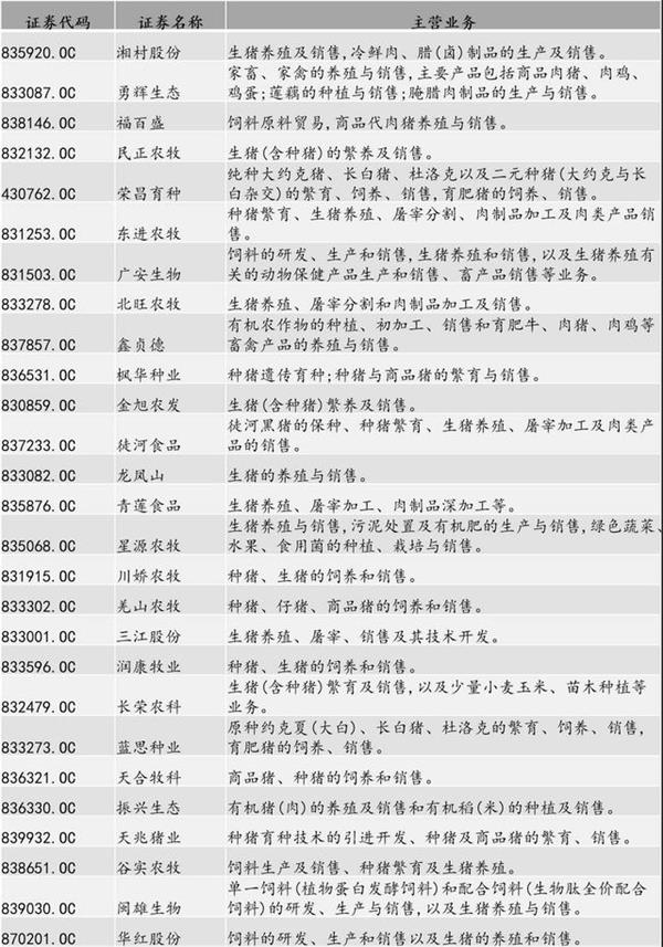 数据显示,截至目前共有27家挂牌企业的主营业务中包含养猪业务。具体包括湘村股份(835920)、羌山农牧(833302)、民正农牧(832132)、荣昌育种(430762)、枫华种业(836531)、龙凤山(833082)等挂牌企业。